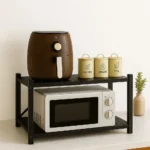 Modern 2-Tier Foldable kitchen storage rack. A stylish and practical solution for organizing your microwave, oven, and kitchen essentials. Designed with convenience and durability in mind, this foldable kitchen rack is made from high-quality carbon steel and finished with a black powder-coated surface for a sleek, modern look that complements any kitchen decor.