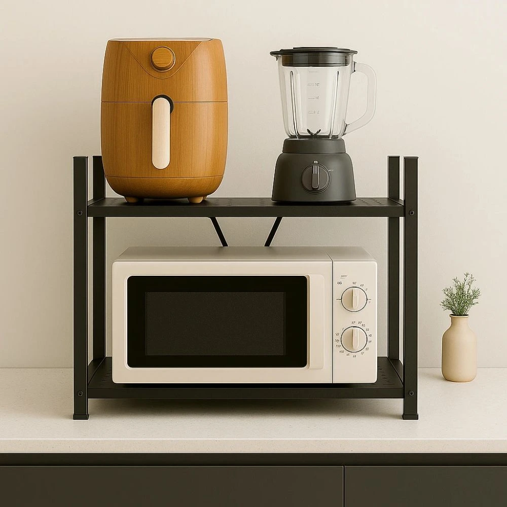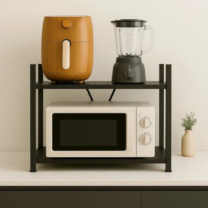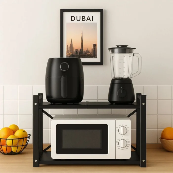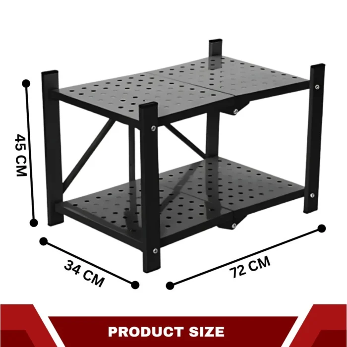 Modern 2-Tier Foldable kitchen storage rack. A stylish and practical solution for organizing your microwave, oven, and kitchen essentials. Designed with convenience and durability in mind, this foldable kitchen rack is made from high-quality carbon steel and finished with a black powder-coated surface for a sleek, modern look that complements any kitchen decor.