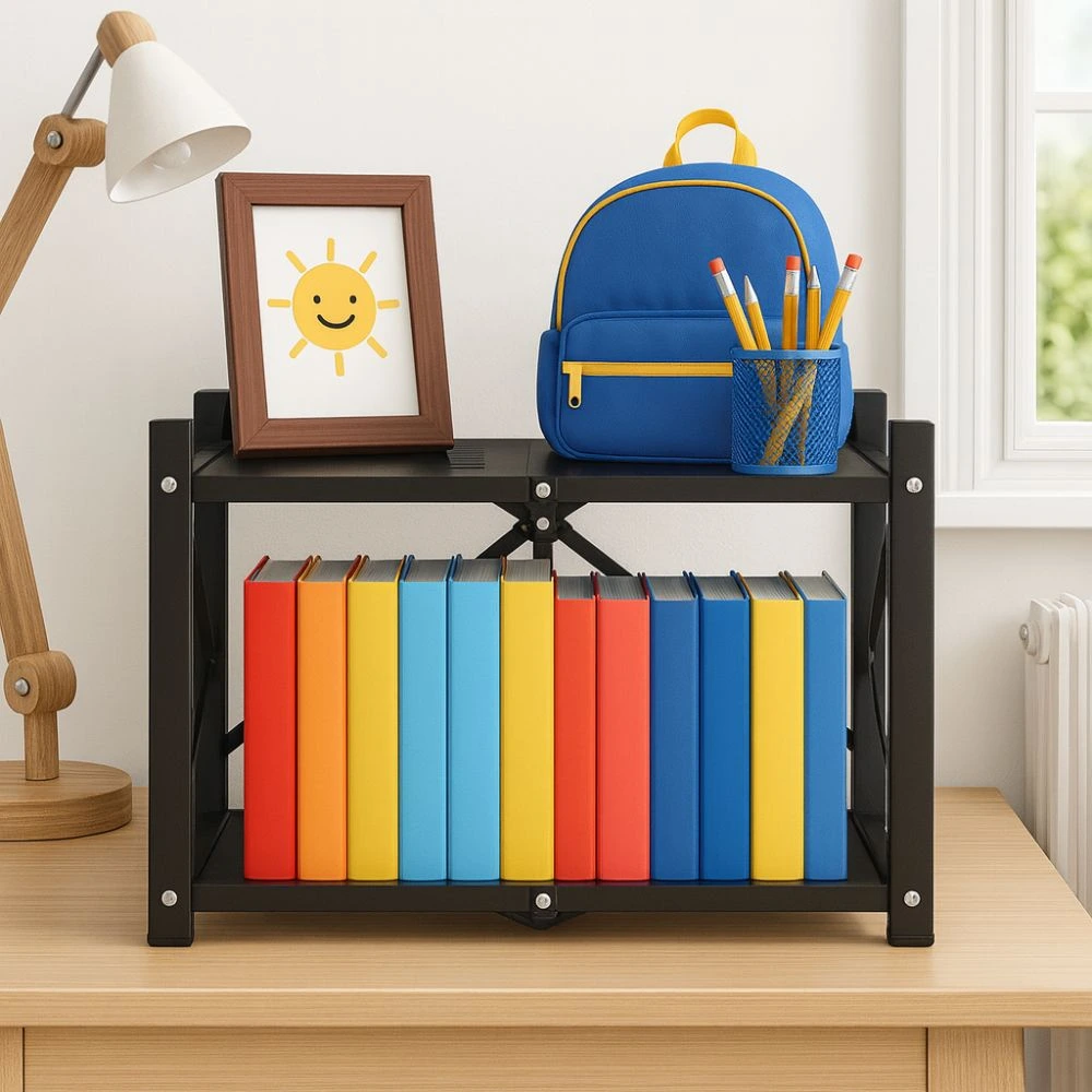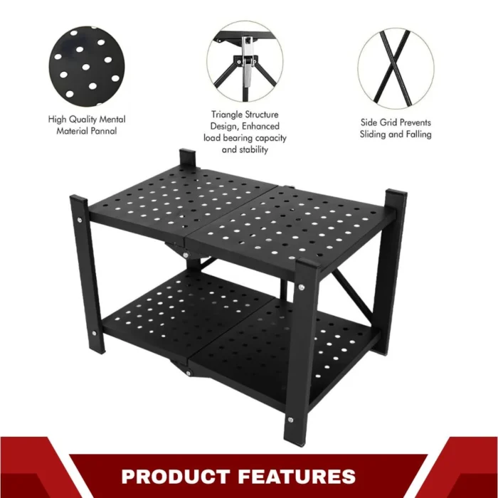 This double-layer kitchen rack requires no assembly, no tools, and no screws — simply unfold and use! Its foldable design allows you to move it easily or store it away when not needed, making it a perfect space-saving kitchen organizer. Whether used as a countertop rack, microwave stand, or oven shelf, it provides strong support and stability for all your kitchen appliances and accessories.